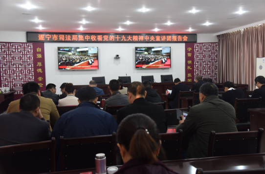 11月8日上午,遂宁市司法局组织全体党员干部职工在局八楼会议室,集中收看学习贯彻党的十九大精神中央宣讲团报告会电视直播。此次报告会由中央宣讲团成员、中央党史研究室主任曲青山作专题宣讲。