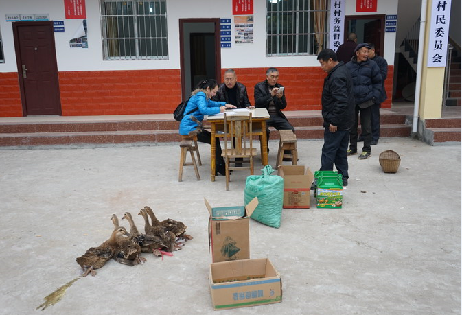 上午10点,收购活动在幸福村办公室院内有条不紊的进行,大队工作人员帮助装米、收蛋、上称、登记和结款,以市场价收购了7户贫困户家自养自产的土鸡、土鸭、鸡蛋、鸭蛋、大米、红薯粉、花生、蔬菜等农产品,共计2602元。最后,财务室工作人员与村干部预约了下一次收购的时间和具体农产品。