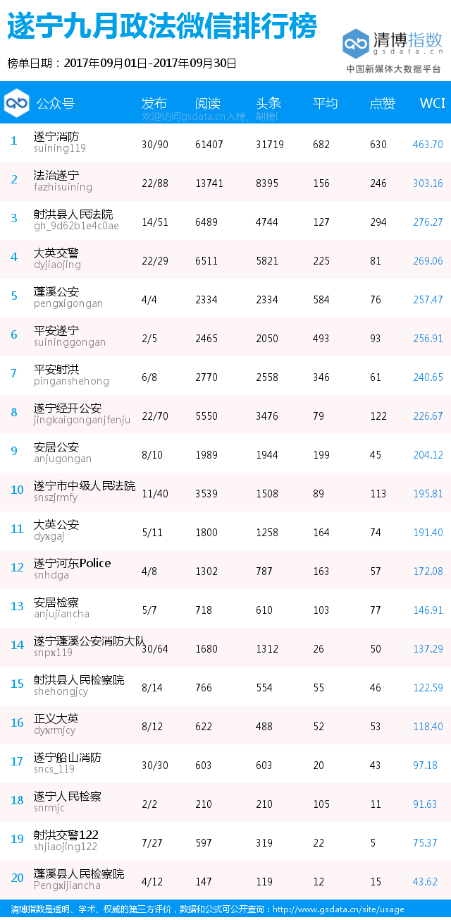 为进一步推进遂宁市新媒体矩阵建设,推动各家政法单位规划提升新媒体运营水平,四川法制报新媒体中心将持续为大家推出遂宁市政法系统微信排行榜榜单(数据来源清博指数),囊括了遂宁市中级法院、遂宁市检察院、遂宁市公安局、遂宁市司法局的各家微信公众号,以月为单位推出榜单,以便各家政法单位了解微信数据、调整运营策略、进行长远规划。