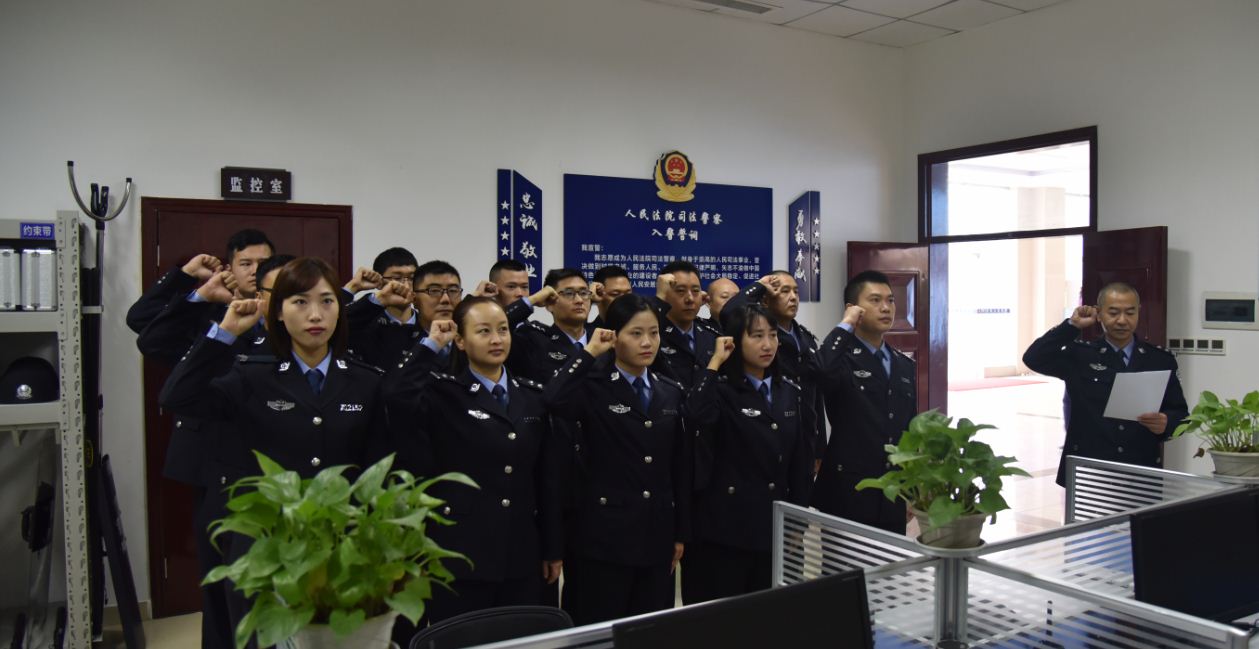 在宣誓仪式上,全体司法警察面向习近平总书记提出的“四句话、十六字”总要求和警徽,整齐列队,高举右手,齐声宣誓:我自愿成为人民法院司法警察,献身于崇高的人民司法事业,坚决做到对党忠诚、服务人民、执法公正、纪律严明……嘹亮的口号响彻在大队会议室。