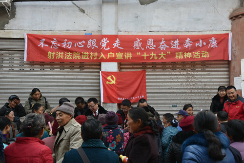 11月30日,射洪法院第一支部书记杨武带领8名结对帮扶干警深入到结对帮扶的官升镇青果村集镇和易地搬迁集中安置点,用“大白话”向广大群众宣讲十九大提出的乡村振兴战略等新思想、新观点、新目标,让党的十九大精神家喻户晓,以党的十九大精神为指引助力打赢脱贫攻坚战。