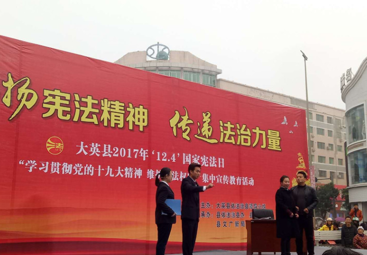 12月4日是我国国家宪法日。为加强法治宣传教育工作,推动法制大英建设,大英县人民检察院参加了由大英县依法治县领导小组主办的“12.4” 国家宪法日——“学习贯彻党的十九大精神,维护宪法权威”集中宣传教育活动。